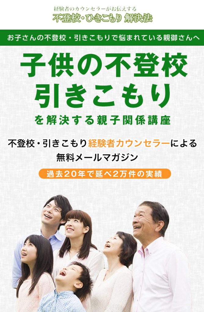 私のメールマガジンではこの規範意識の改善から、お子さんとの具体的な関わり方まで、不登校や引きこもりから立ち直る秘訣をお伝えしていきます。